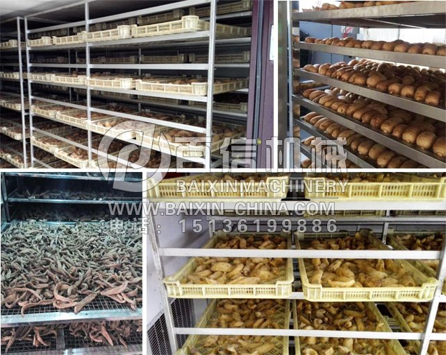 該項目位于貴州大方縣,為天麻烘干,烘干的形態(tài)為球莖狀(即:塊狀),物料的除含水:70-80%,產品的終含水:<10%,水分存在形式包括自由水分(可流動水)及毛細管水分,結合水,其他特性為粘性、熱敏性、多糖。烘干11層,采用耐高溫PE托盤,托盤尺寸810*595*40mm。每個烘車共22個托盤,每個烘車載重量為165kg。烘房尺寸為:5400*3000*2900mm,設計烘房穿流風速為2米,烘干房循環(huán)風機為2臺1.1kw。